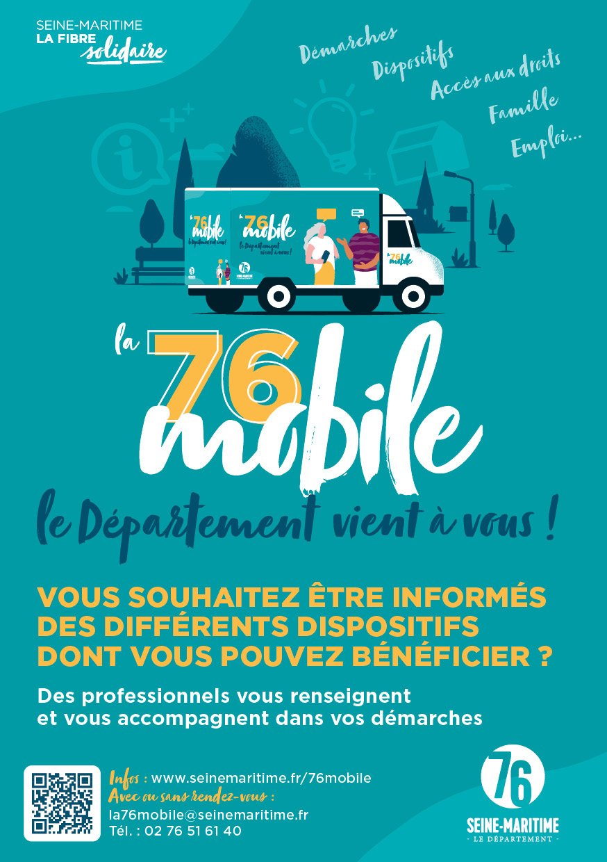 La 76 mobile est un dispositif départemental itinérant ayant à son bord plusieurs professionnels : assistante de service social, secrétaire médico-sociale et conseiller numérique.